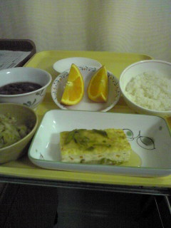 ごはん 燻製豆腐 煮豆 キャベツのかつおあえ オレンジ